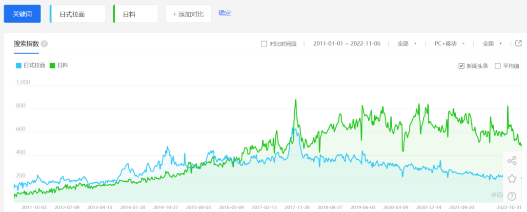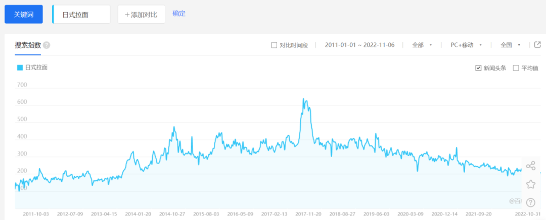 百度指数也显示,2017年年中,“日式拉面”的搜索指数达到了近十年的峰值,可见前几年日式拉面、日式快餐依然有着较高的热度。