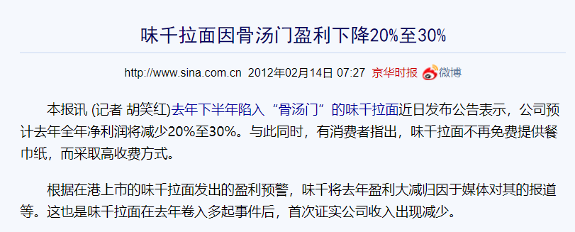 2011年7月,有媒体曝光:味千拉面的汤底并非广告宣传的“当场熬制”,而是浓缩液勾兑而成。