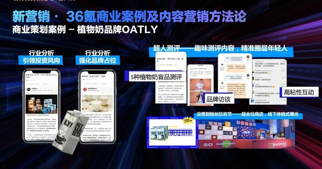 我们先帮企业把植物奶细分赛道这个概念讲出去,然后从品牌本身出发做产品解读、行业分析、做创始人专访;这还不够,我们在消费测评栏目做多款植物奶横评、做盲测,这个内容在社交平台的互动率非常高;最后还在36氪自己的线下IP大会上搭台子,做体验式曝光。