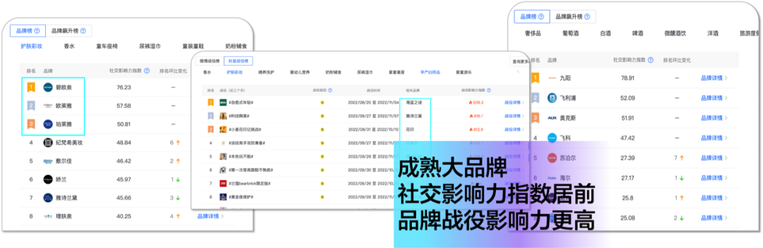 国民购物车的投票是最直接的。比如刚刚过去的双十一,在美妆、3C这些主要门类里,成熟大品牌依旧霸榜。包括我们从第三方数据机构拿到的一个近期品牌社交影响力指数的排名和变化情况,传统品牌还是很强势。