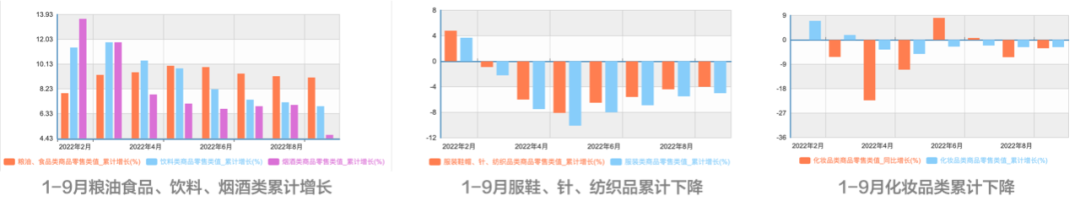 从宏观经济数据的维度上看也能总结一些趋势性方向,几乎和上述钱的流向相吻合。我们看国家统计局给出的1-9月消费市场不同赛道的走势,粮油食品、饮料、烟酒类,比去年同期增长9.1%、6.9%、4.7%,鞋服纺织、化妆品相对有所下滑。