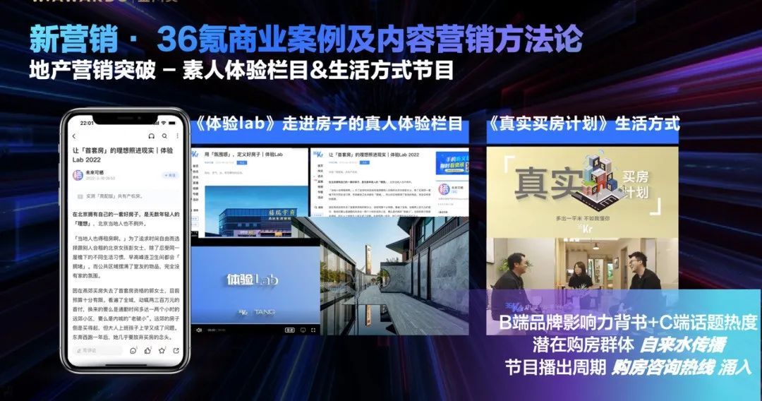 比如,我们给地产行业做的营销突破,就是整合企业和市场的双端诉求,用图文、直播和视频化的能力做了一个新产品叫《体验lab》,通过素人体验、专家的视角评测楼盘。还有一个访谈节目叫《真实买房计划》,有点锵锵三人行那种互动感,但更像一个kol讲生活方式的节目,因为房子容纳的是人的生活。