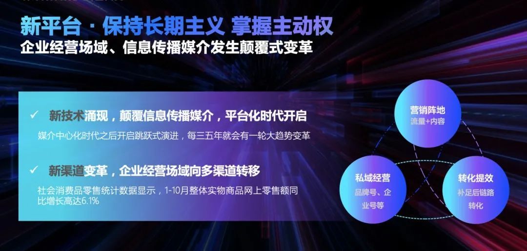 过去10个月实体品牌和零售商都受到了波动影响,但从整体社会消费品零售统计数据来看,实物商品网上零售额同比增长高达6.1%,线上化进程不可逆。而在媒介端,经历过去漫长的中心化时代之后开启跳跃式演进,三五年就会有一轮大趋势的变革,现在是平台化时代。