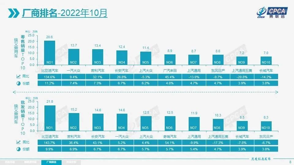 如果说购置税优惠明年延续,车市有戏了,再更进一步可以说中国汽车品牌将拥有更多的市场份额。数据显示,1-10月自主品牌汽车累计销售份额为52%,较2021年同期增长11.4个百分点,头部传统车企转型升级表现优异。