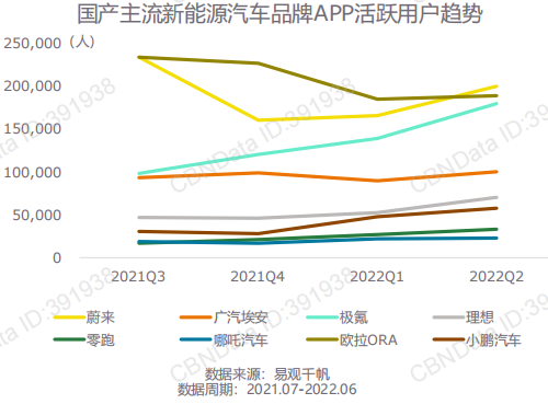 根据易观千帆数据,第一梯队比亚迪、特斯拉两大品牌近一年季度平均活跃用户规模超百万,国产主流新能源汽车中蔚来、欧拉的季度活跃人数在20万左右。迈入2022,国产新能源汽车品牌APP活跃情况呈缓慢上升趋势,其中,极氪的增长态势较为明显。