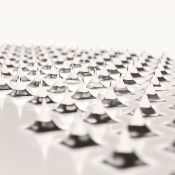 微针是指直径小于几十微米、长度为25~2000μm的针状结构。微针透皮给药是由数枚至数百枚细小微针组成的阵列,通过刺穿皮肤上角质层,产生允许药物分子直接传入皮下的通道,实现药物输送;微针给药具有不易刺激神经末梢,不会或较少产生疼痛感等优点。