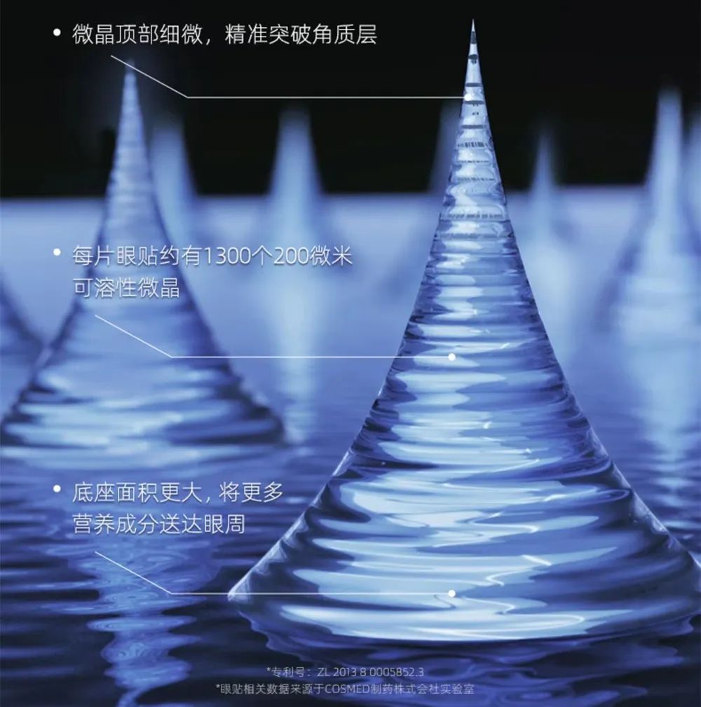 在微博、小红书等社交平台上,有一款微针眼膜被网友所推崇,这款来自日本的眼膜据称拥有“可溶性微晶”专利技术,眼膜表面排列着多根微针,能注入表皮深层,使玻尿酸更易吸收。