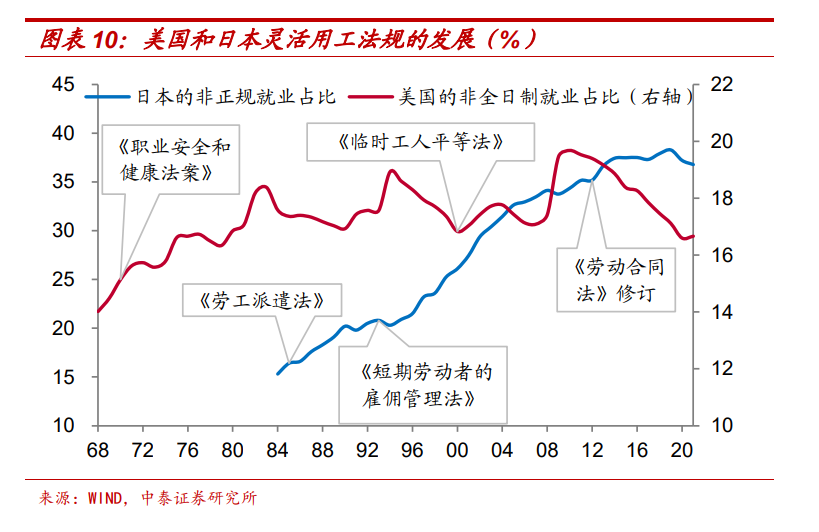 谈起灵活就业,就不得不提灵活用工的“鼻祖”日本。虽然这一形态最早诞生与上世纪20年代经济萧条中的美国,但真正发扬光大却是在我们的近邻日本。从1950年代经济高速增长期开始出现的外出务工劳动者和临时工,1960年代后期开始增加以已婚女性为主的临时工,到1980年代后出现派遣劳动者、契约劳动者等,灵活用工的形式和人数逐渐增多。经济泡沫破碎后,日本的灵活用工数量逐年大幅上升。根据网传数据,2015年后,日本临时用工数量甚至已经达到总用工数量的三分之一,这与人们印象中日本企业都是终身制背道相驰。