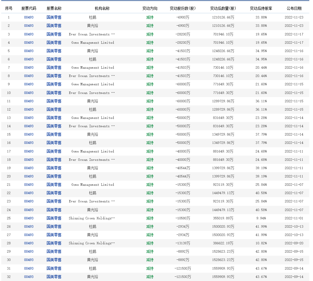 然而,黄光裕的一个举动,再次让呼吁“相信公司”的口号,变成了个笑话。据东方财富网显示,仅11月国美零售大股东黄光裕及其配偶杜鹃已减持6次,持股比例从41.99%降至33.88%。据统计,2022年初以来,黄光裕及其配偶杜鹃年内减持已超80亿股。