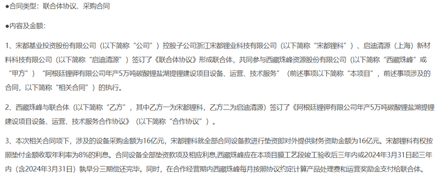 3月13日,宋都股份又发公告称,控股子公司宋都锂科与启迪清源组成联合体,共同参与西藏珠峰的“阿根廷年产5万吨盐湖提锂项目”。其中,宋都锂科进行垫资16亿元,接近去年末宋都股份净资产的40%。