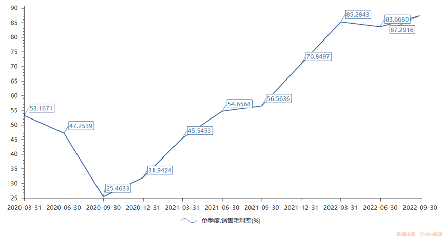 今年第三季度,天齐锂业的单季度毛利率创下87.3%的新高,通俗地理解,天齐把成本仅12.7元的商品,以100元售价卖出去了。