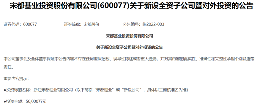 在2021年亏损接近4亿的情况下,宋都股份在今年1月公告称,将投资5亿元成立宋都锂业,投资额超过去年末净资产的10%。