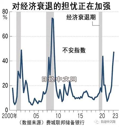 费城联邦储备银行11月发布经济学家等专家调查,显示2023年1~3月美国实际国内生产总值(GDP)比上季度下降概率的“不安指数”为47.2%,提高至雷曼危机发生前的水平。该调查自1960年代开始实施,过去在不安指数上涨之后,因IT泡沫破裂等原因而进入经济衰退。