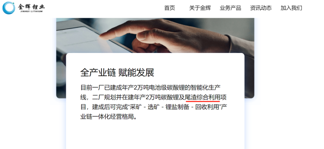江西金辉锂业官网显示,该公司的业务特色就是锂渣综合利用。说白了,就是通过低品位的尾矿和锂渣,提炼出3%品位以上的锂精矿,以供提炼碳酸锂。