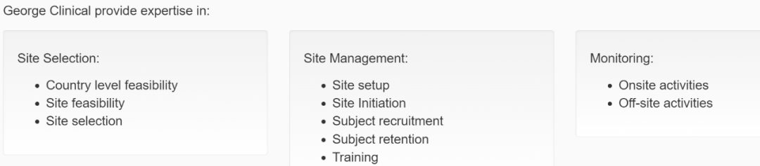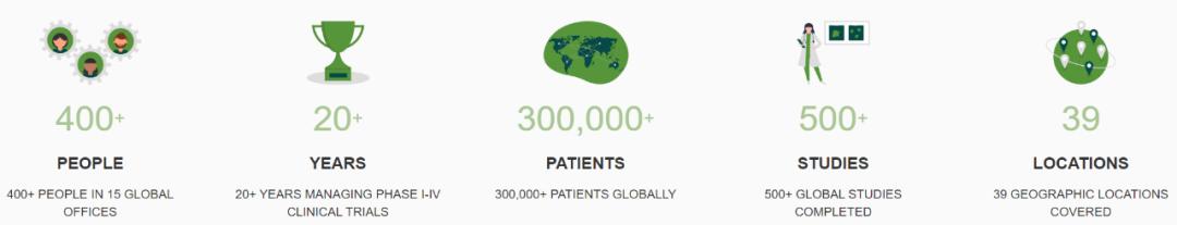 数据表明,George Clinical有400+名员工,遍布全球15个办事处;具有20+年管理I-IV 期临床试验的经验;为全球300,000+患者提供服务;完成了500+项全球研究;业务覆盖39个地理位置。