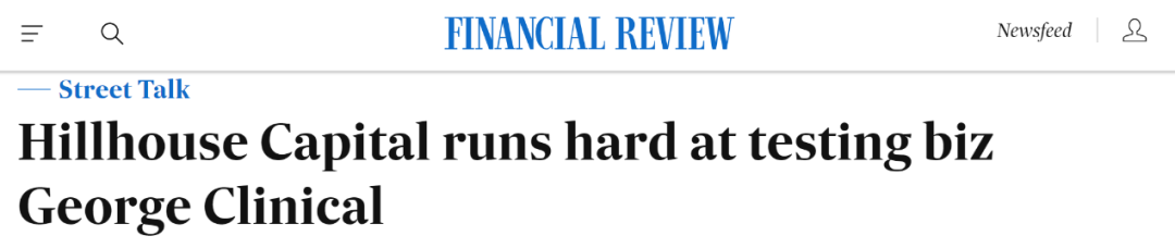 近日,FINANCIAL REVIEW在《Hillhouse Capital runs hard at testing biz George Clinical》新闻中提到,总部位于新加坡的私募股权投资机构(Hillhouse Capital)正在考虑收购澳大利亚临床研究机构George Clinical (乔治临床),George Clinical是接下来几周内众拍卖标的(auction)的一部分,这也意味着高瓴资本能否顺利买下George Clinical依然存在着诸多不确定性,且高瓴资本也只是本次拍卖的众多“竞买人”(lead contender)之一。