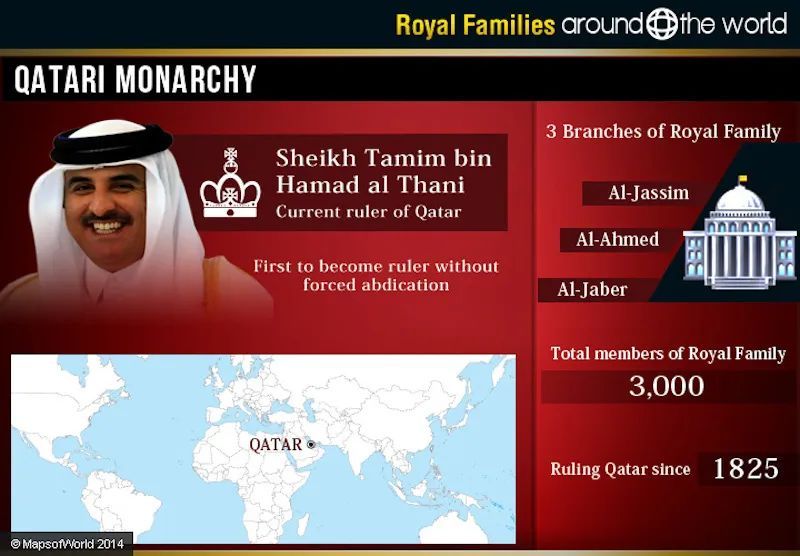 卡塔尔王室由阿勒萨尼家族(Al Thani family)领导。该家族成员几乎垄断了最重要的政府职位和部门。该家族还会通过与有影响力的氏族联姻的方式获得影响力和权力。