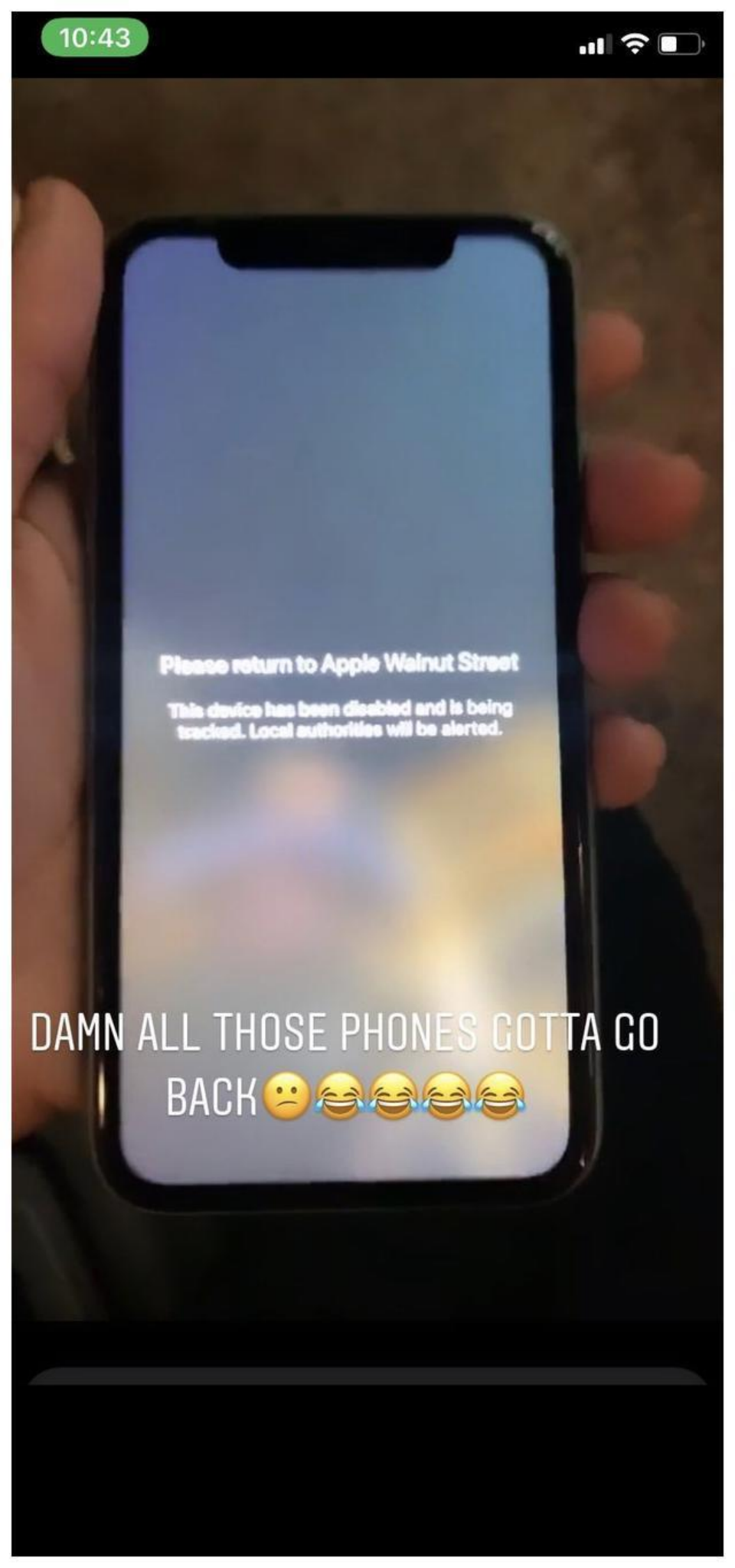 曾经有名网友就发推文称,被盗的iPhone屏幕上出现了一行字:"请将手机归还到苹果核桃街店。该设备已被禁用,正在被跟踪,地方当局将收到警报。”