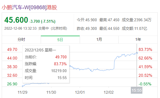 11月28日收盘时,小鹏的股价还钉在每股26.05港元——接近11月初创下的历史低点,一周后的12月5日,小鹏报收每股49.3港元,周涨幅90.7%,强势领衔新能源车板块反攻。