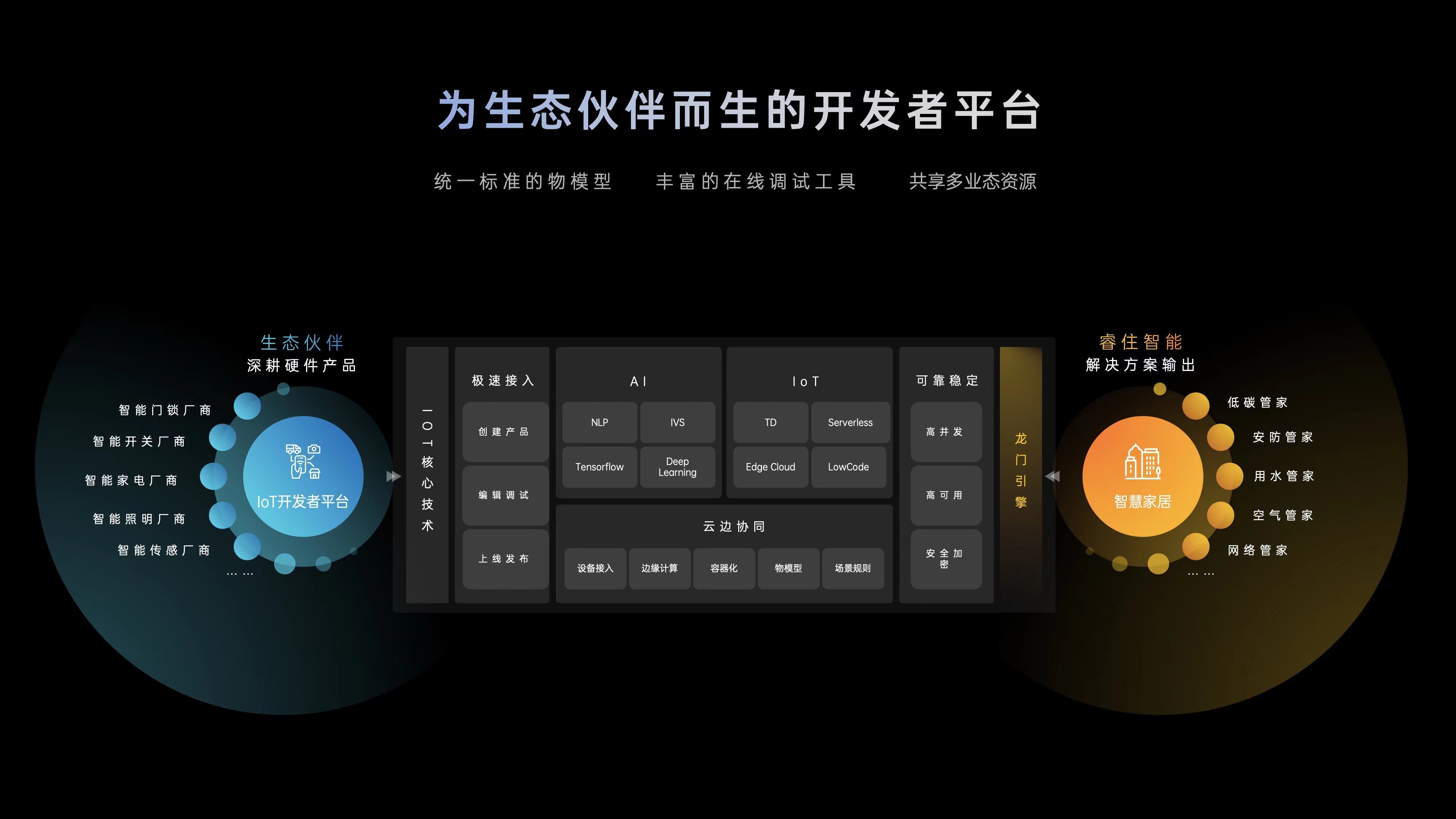 在化繁为简问题上,睿住云给出了他们的答案——以最新的微服务架构为基础,构建一个比开发者平台强大得多的系统结构:底层边端、AIoT中台、Saas层。边端与Saas层的有机联结,要依赖强大的AIoT中台能力,这也是睿住在过去几年间重点建构和打磨的核心技术。睿住智能CTO张振中对36氪表示,作为“六边形战士”的开发者,睿住最引以为傲的能力是物模型引擎和开发者平台。