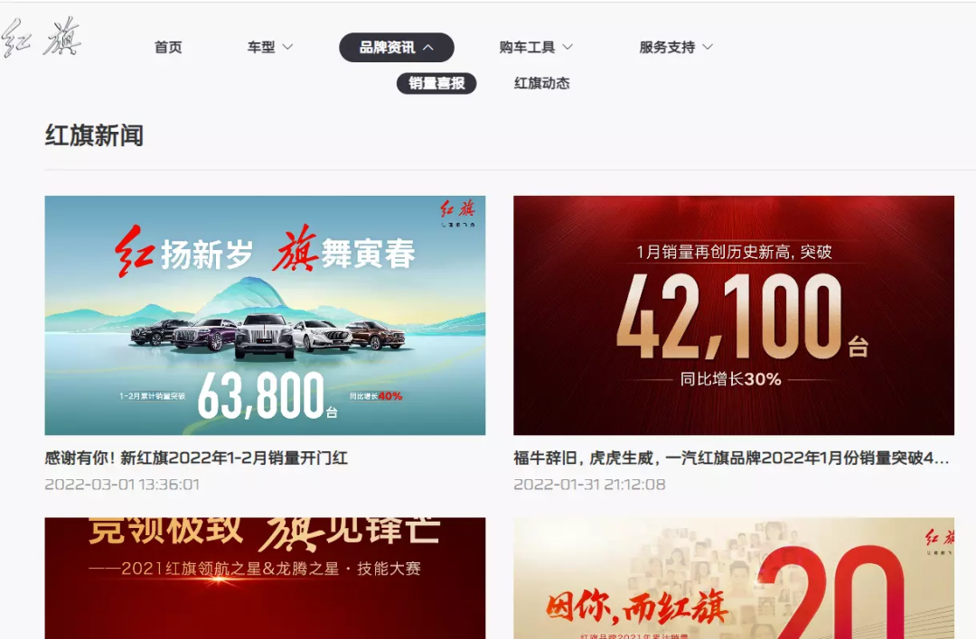 当时间走进2022年,连续多年声量大涨的一汽红旗却在减少发声。由于近年来的业绩飙升,一汽红旗官网的品牌资讯页面还专门设置了“销量喜报”一栏。但这一栏自2022年3月1日后便再未更新过。