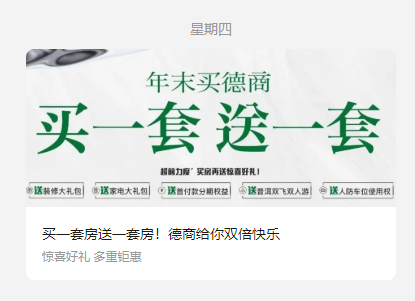 12月1日,德商集团在官方微信发布推文,标题为《买一套房送一套房!德商给你双倍快乐》。