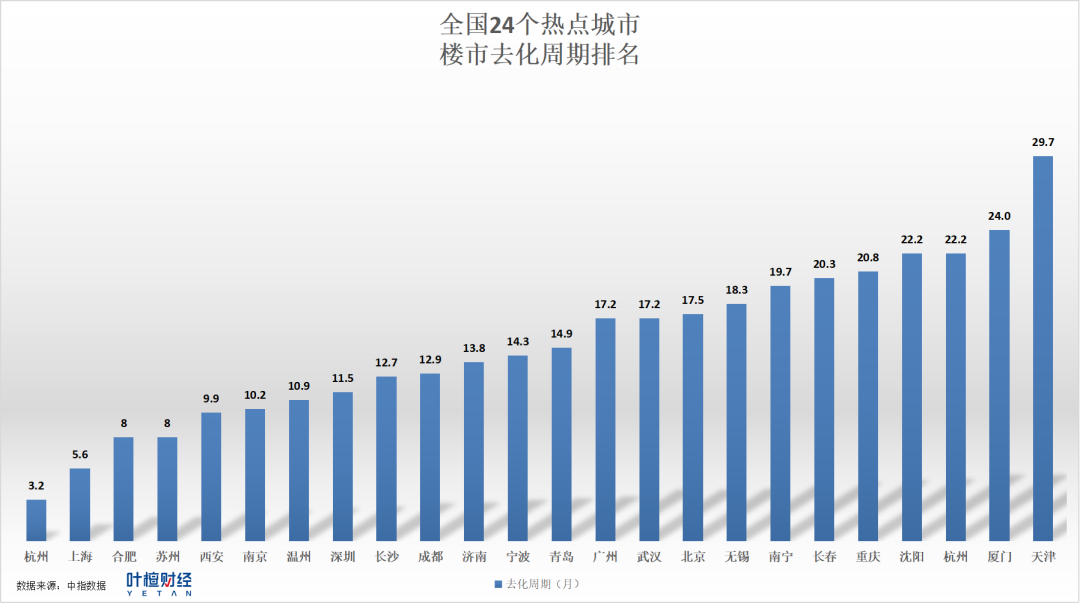 杭州、上海、合肥、苏州、西安的去化周期在10个月以内,最短的杭州只有3.2个月,上海是5.6个月,接近五年来最低水平。