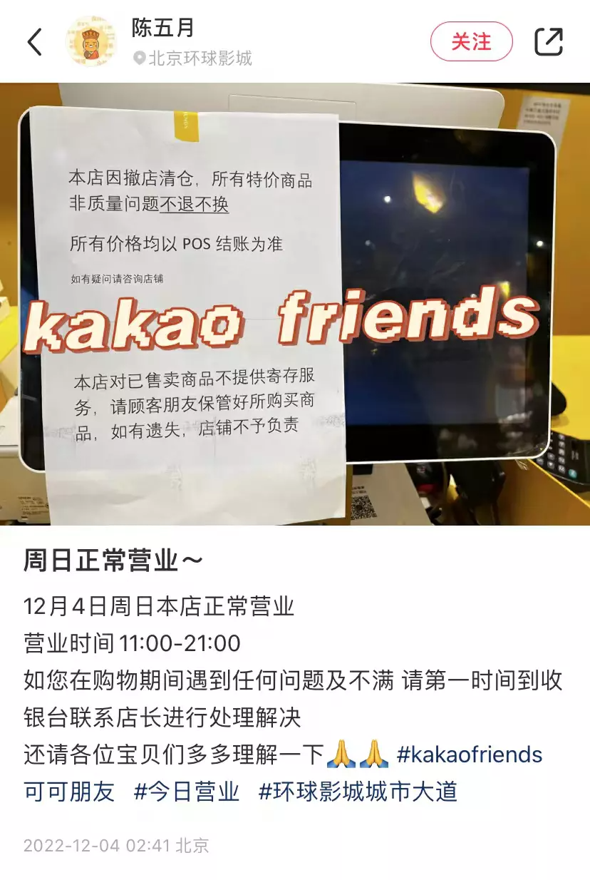 Kakao Friends 起源于韩国手机聊天软件KakaoTalk的表情包,后来延伸出多个IP形象。对于此次的闭店行为,虽然商家并没有给出明确解释,但门店负责人@陈五月在小红书指出,本次清仓活动从15号开始,由于部分店员还在封控中,所以只能线上监控销售情况,对于突然爆满,店员也分不清谁是黄牛,谁是真正的粉丝。