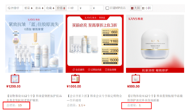 韩束在创新上乏善可陈,新产品上也似乎总是慢半拍,以至于其品牌力和爆款产品都无法和其他大厂的主品牌抗衡。例如,在高端化妆品市场上,韩束于今年推出的超高端产品蓝铜胜肽水乳及面霜,在淘宝平台售价高达999元/瓶,意图通过韩束科研蓝铜肽技术来覆盖抗衰、除皱高端领域市场。