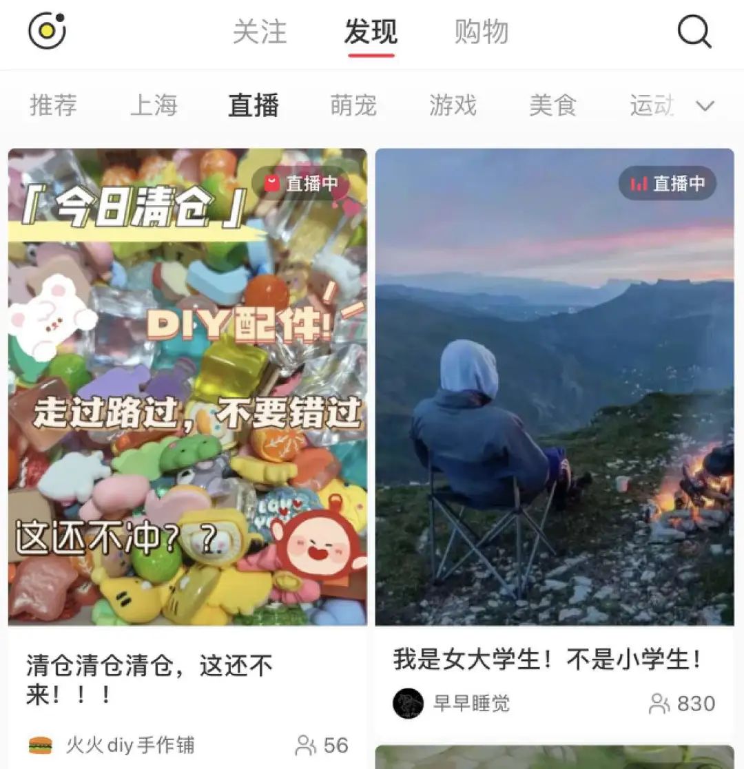 据了解,今年2月开始,小红书发现页的推荐栏中也会随机出现实时热门直播间。除了右上角的“直播中”和右下角的“观看人次”两个标志之外,小红书直播间的展现形式与笔记基本一致。对此,有网友表示,“有时候点进去才发现是直播间”。
