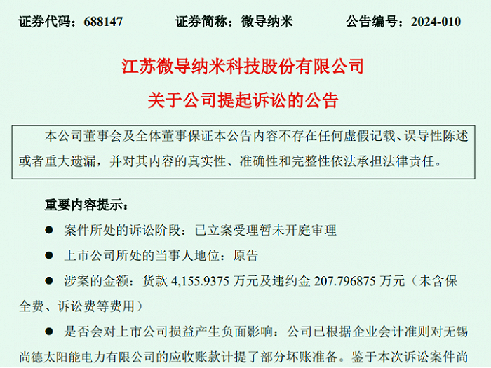 3月19日,微导纳米公告:已向法院提起诉讼,要求无锡尚德支付公司货款4155.94万元及违约金207.8万元。