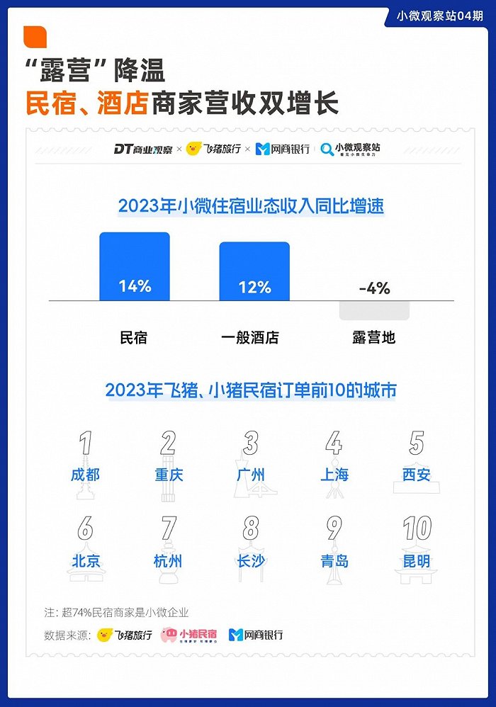 据网商银行小微观察站的统计,2023年小微住宿业中,民宿营收同比增长了14%,较一般酒店高出2个百分点。而露营地等业务逐渐降温,呈现出负增长的态势。
