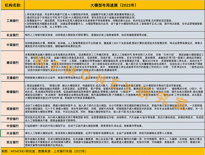 WEMONEY研究室梳理上市银行2023年年报发现,包括工商银行、农业银行、中国银行、建设银行、交通银行、邮储银行等国有大行,以及招商银行、中信银行、兴业银行、平安银行、民生银行等多家股份行,已在积极推动大模型布局,并有具体应用落地,已有数据支撑大模型提质增效的效果。