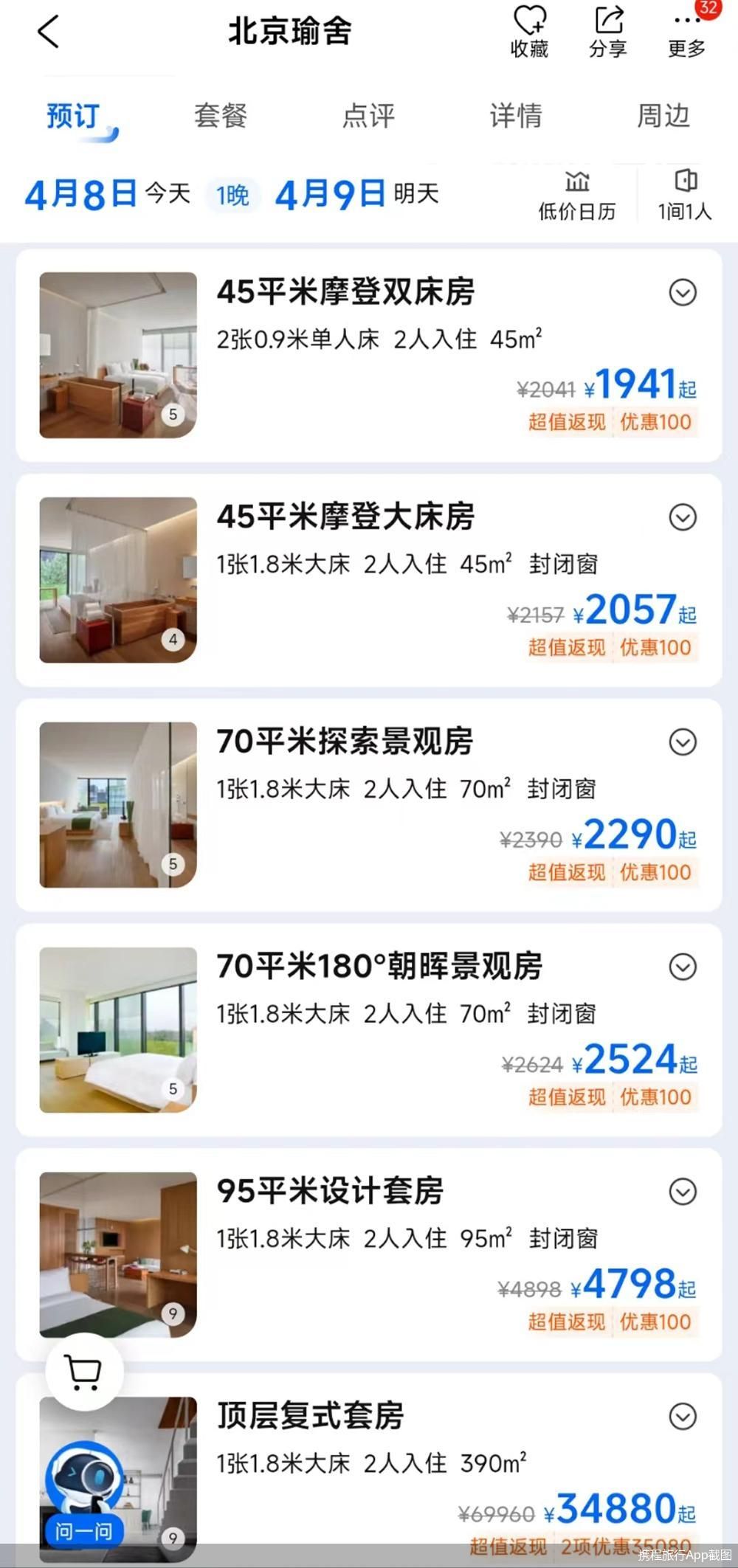 据了解,北京瑜舍酒店于2008年开业,坐落于三里屯太古里北区南端,拥有99间客房,包括9间套房及1间顶层复式套间,定位精品、设计师酒店。携程旅行App显示,4月8日45平方米摩登大床房房价在2057元/晚,时尚套房、时尚露台套房等房型均显示已订完,当日最高房价为34880元/晚(顶层复式套房)。