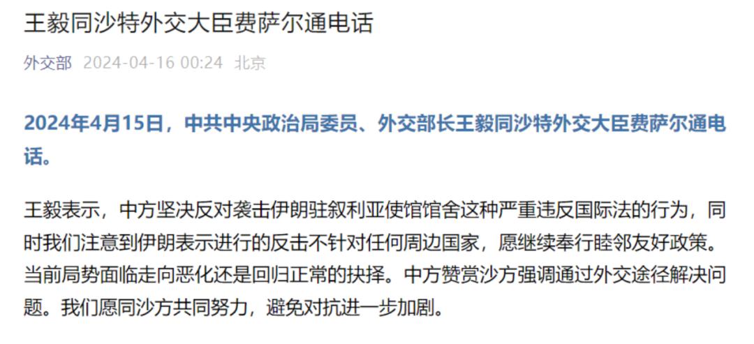 王毅表示,中方强烈谴责并绝不允许伊朗驻叙利亚大使馆舍遭袭,认为这一事件严重违反国际法,是不可接受的。中国注意到伊朗表示,伊朗采取的行动是有限的,这是对馆舍袭击行使自卫权,称赞伊朗强调不针对地区国家和周边国家,并重申继续坚持和谐邻里的友好政策。认为伊朗能把握好形势,在维护伊方主权和尊严的同时,防止形势进一步动荡。