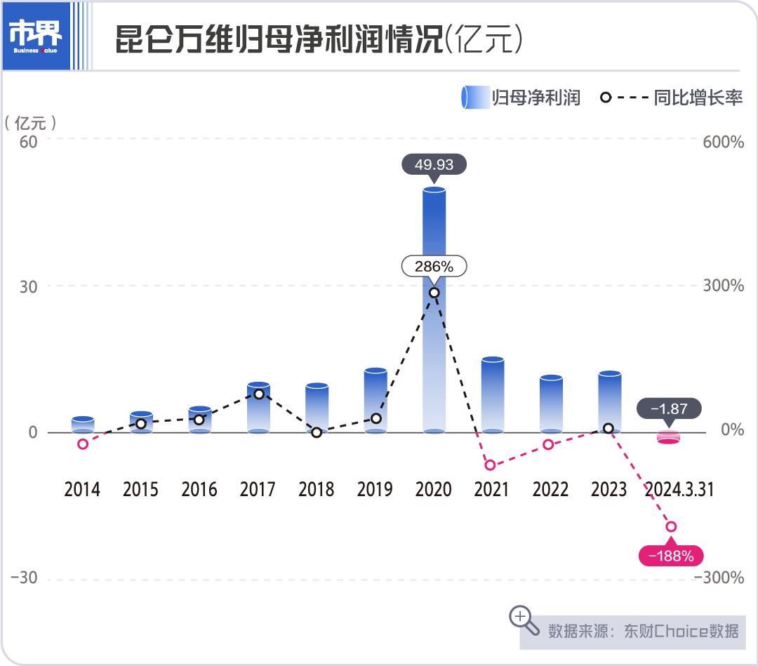 随着大模型时代的到来,资本圈被称为“风口捕手”的周亚辉毫不奇怪地将AI划入了自己的领地。他实际控制的昆仑万伟股价在2023年上涨,一度创下了“神话”的四倍。然而,在喧嚣之下,昆仑万伟在模型市场继续掘金并不容易。2024年第一季度,昆仑万伟归母净利润同比下降188%,创下近十年最差纪录。