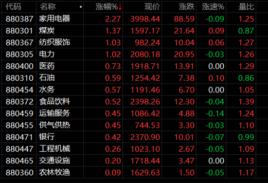 家用电器、煤炭、电力、药业、石油、银行等板块收涨。