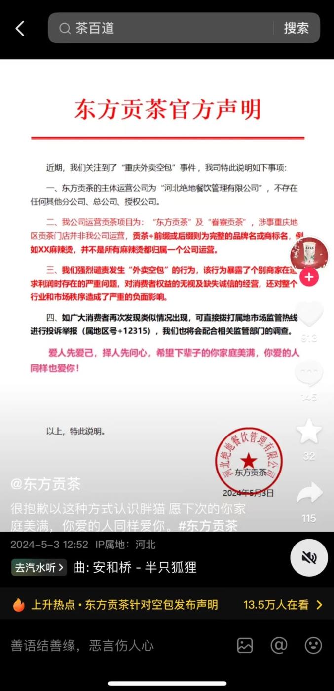 东方贡茶发文谴责外卖空包行为,称涉案门店非企业经营。