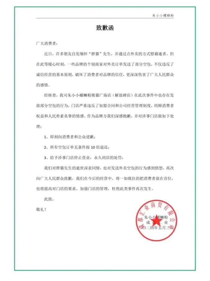经核实,我公司朱小螺蛳粉熊猫广场店(解放碑店)在此次事件中发放空包,严重违反加盟协议和公司管理制度,无视消费者权利和人民淳朴真挚的情感。造成了非常不好的影响,所以我们深表歉意。