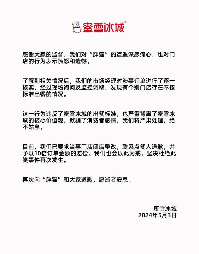 蜜雪冰城还发表声明称,已要求当事商店关闭整改,联系点餐人道歉并赔偿。