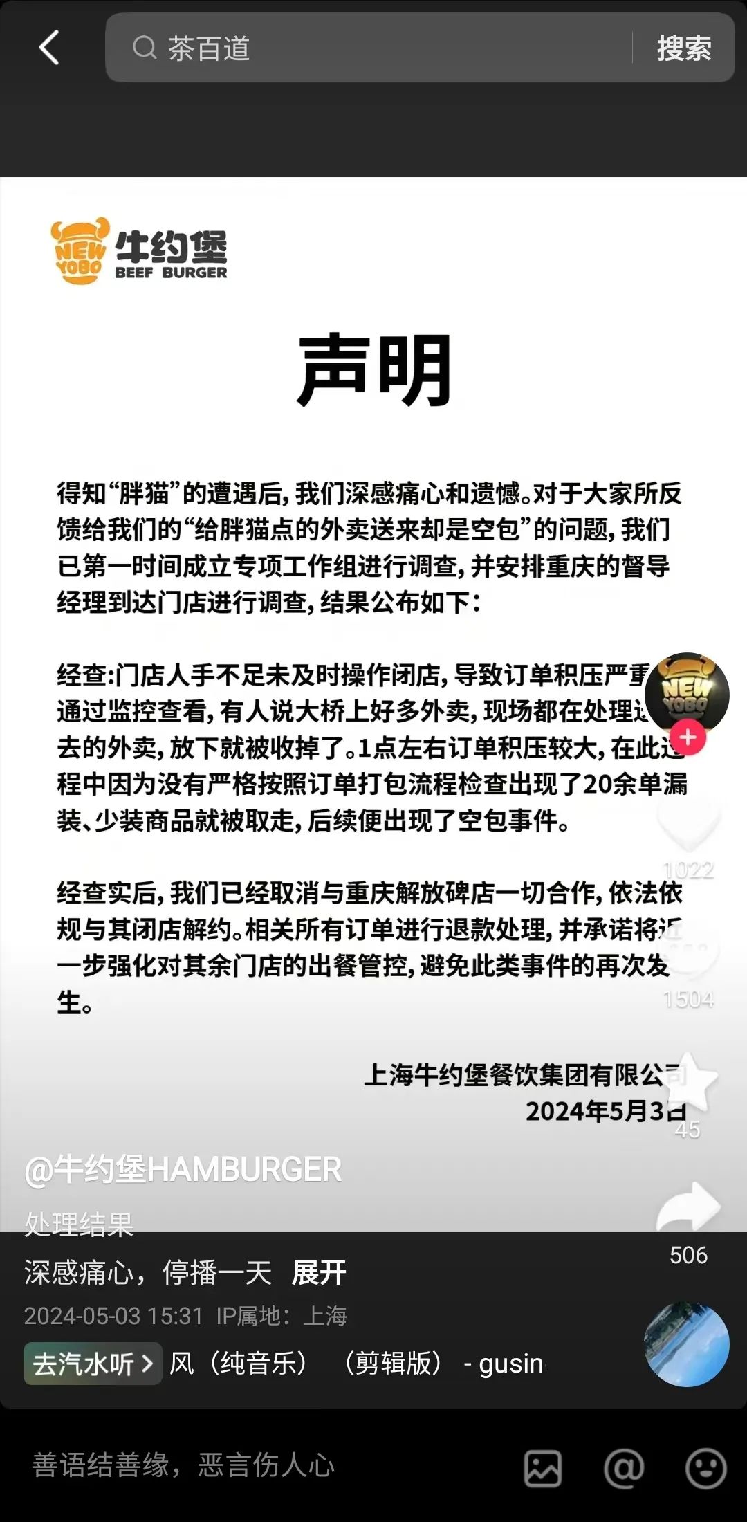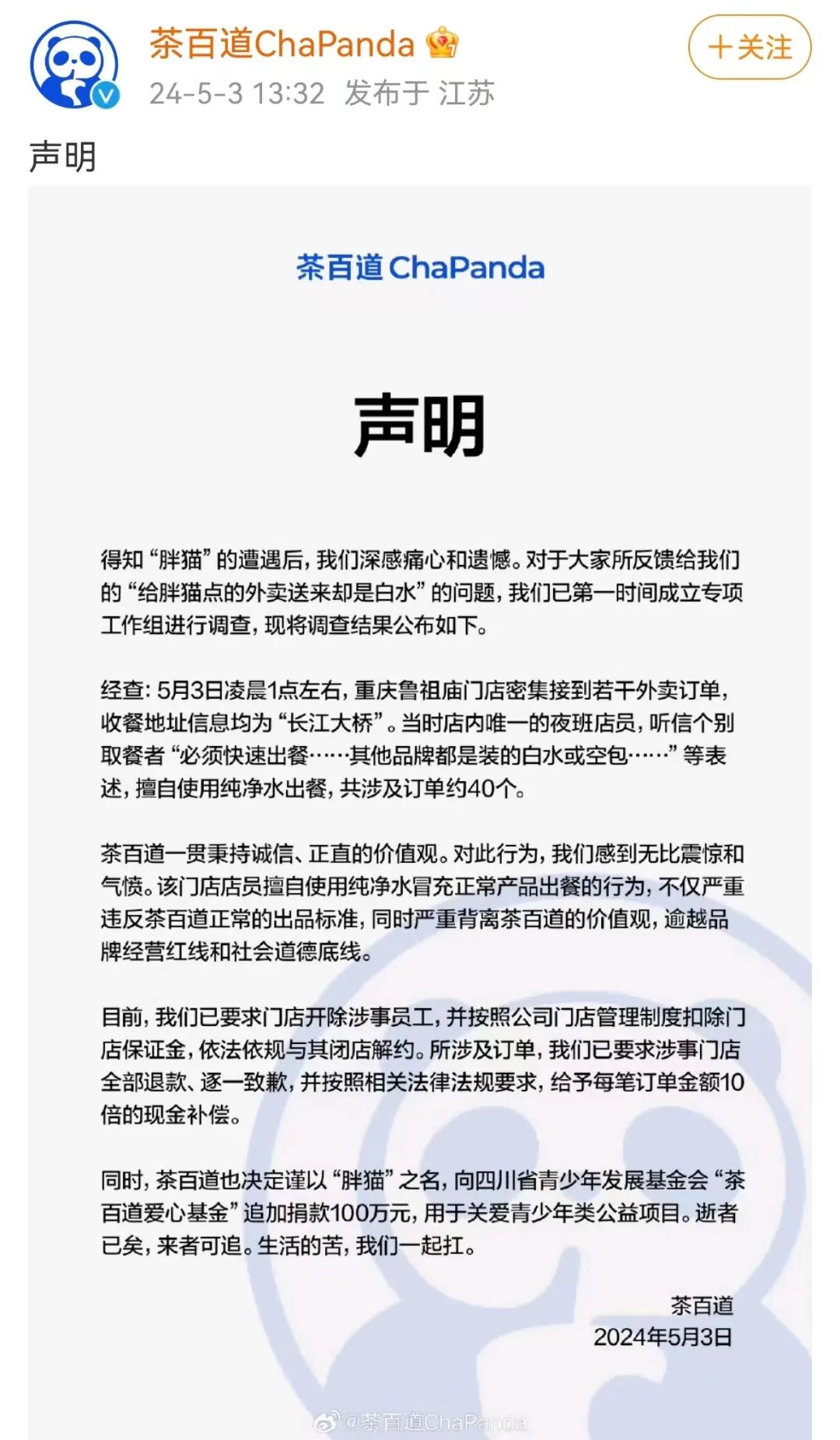 5月3日,茶百道就“点外卖变清水”事件发表声明称,当时店内唯一的晚班店员相信个别餐饮人员“一定要快点吃饭……其他品牌都装了清水或空袋……”,并擅自用纯净水吃饭,涉及约40个订单。对于这种行为,我们感到非常震惊和愤怒。已经要求店铺开除涉案员工,并按照公司店铺管理制度扣除店铺担保金,依法依规解除店铺合同。