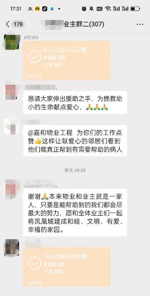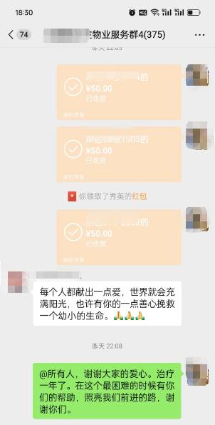在物业的号召下,凤凰城社区的业主纷纷留言“霸屏”。他们有的捐款,有的捐款,有的通过分享求助信息来扩大影响力。几天之内,300多户居民全力帮助,筹集了1万多元捐款。