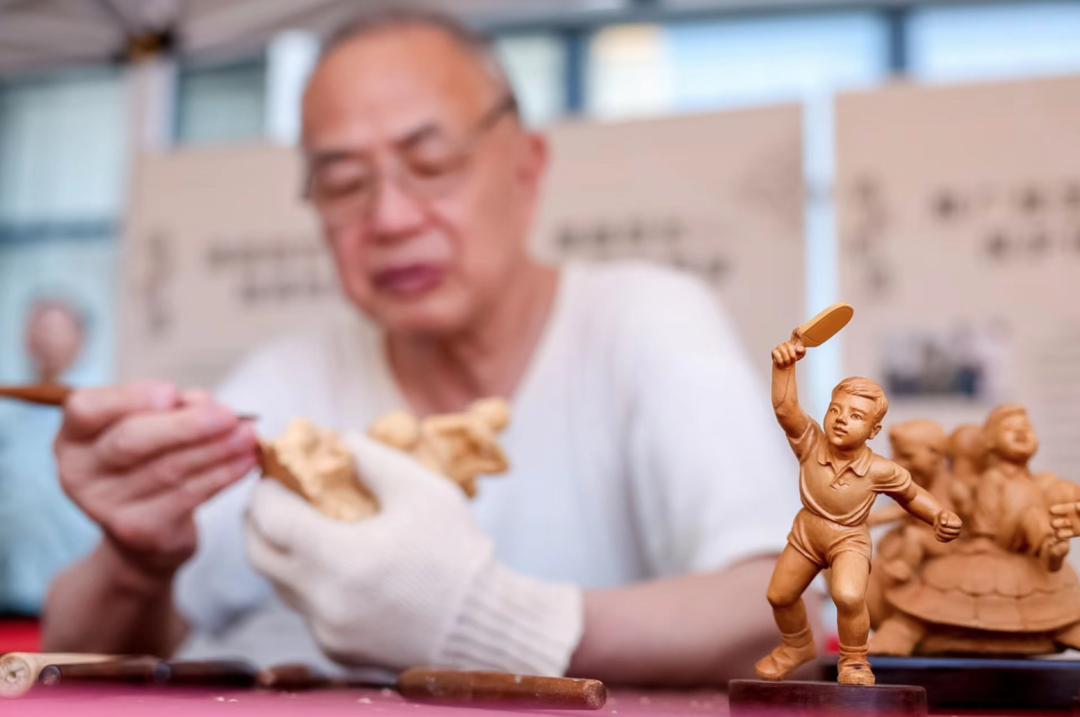 在黄杨木雕摊前,80多岁的黄杨木雕市级传承人陈华明迎来了一波又一波的市民。他们经常拍照展示作品,对生动的雕刻技术感到惊讶。有人奇怪地向陈师傅了解黄杨木雕的过程,询问内容的价格,也有人说要向陈师傅学习雕刻。