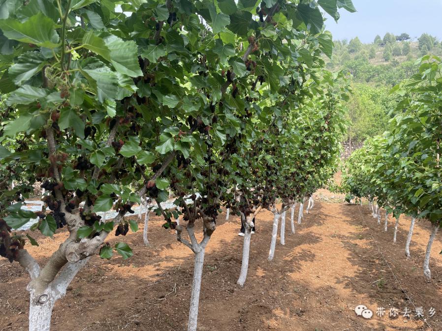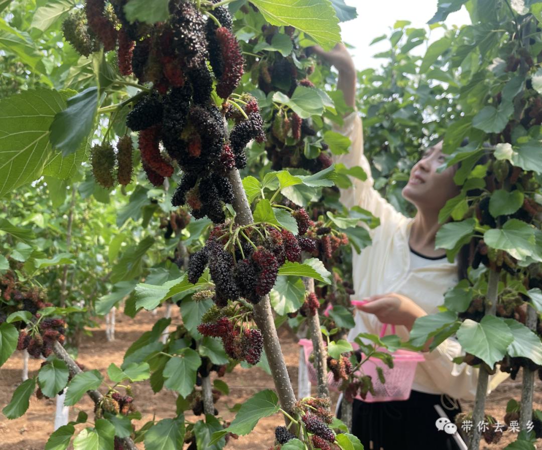在郁郁葱葱的桑树下,游客们手提着水果篮,走过其中,一边收获桑葚,一边品尝美味的食物,一边体验农业采摘的乐趣。