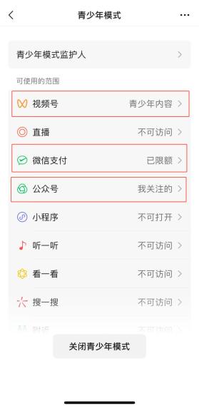 开启微信青少年模式后,青少年客户累计使用视频号和直播时间达到40分钟后,监护人需要输入密码才能延长使用时间,视频号和直播服务不能在每天晚上22:00到第二天早上6:00使用。如果他们需要使用它们,他们必须得到监护人的授权。