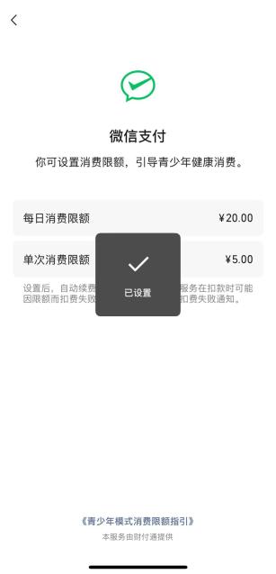 父母或监护人可以在青少年模式下设置微信支付限额,包括“日常消费限额”和“一次性消费限额”。设置完成后,青少年使用微信支付时,将受到已设定的限额。
