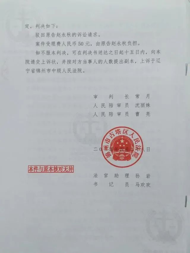 辽宁省锦州市古塔区人民法院判决。图片/受访者提供