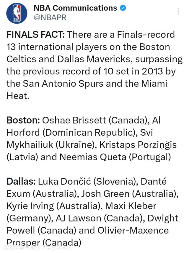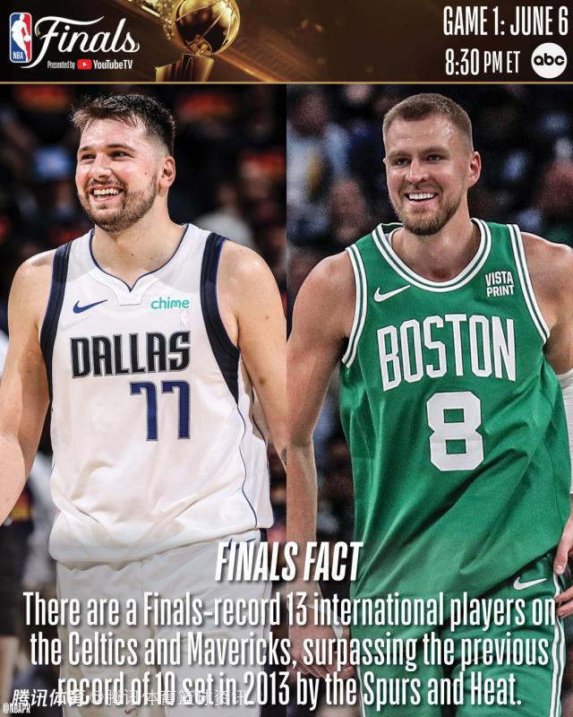 北京时间 6 月 6 日,根据 NBA 官方 PR 报告显示,在今年的总决赛中,凯尔特人和独行侠的总名单上, 13 超越了著名的国际球员 2013 在年马刺和热火总决赛中,总共有 10 著名国际球员参加比赛的记录, NBA 总决赛历史新高。