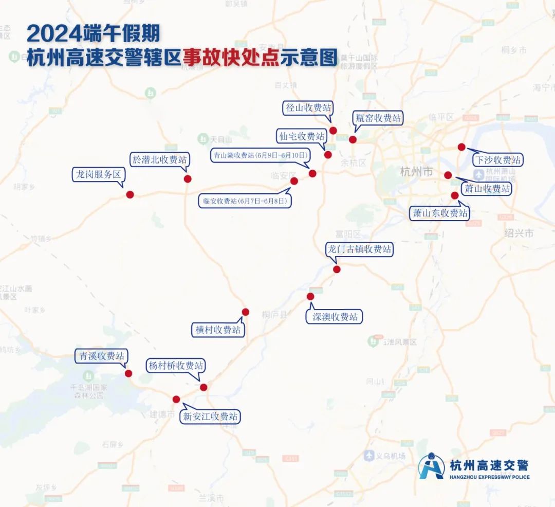 为了更好地方便人民,为司机和乘客服务。端午节期间,杭州公安高速交警结合辖区流量和事故特点,设置了16个事故快处点,G56杭徽高速临安收费站(6月7日至6月8日)、青山湖收费站(6月9日至6月10日)、G92杭永高速萧山收费站、G60杭金衢高速萧山东收费站、G4012溧宁高速新安江收费站、青溪收费站、G6021杭长高速杨村桥收费站、S14杭长(宜)高速公路路山收费站、瓶窑收费站、S43杭州绕城西复线仙宅收费站、G25杭新景龙门古镇收费站、深澳收费站、G2504杭州绕城高速公路下沙收费站、S29临时建设高速公路潜北收费站、横村收费站等,全力保障辖区高速公路畅通。