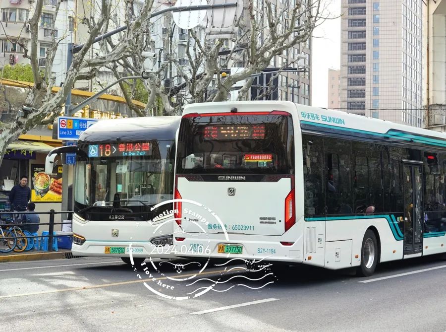 上海18路、597路公交车行驶在鲁迅公园前,分别采用10米车身和12米车身“白金刚”。(图片/秦岭拍摄)